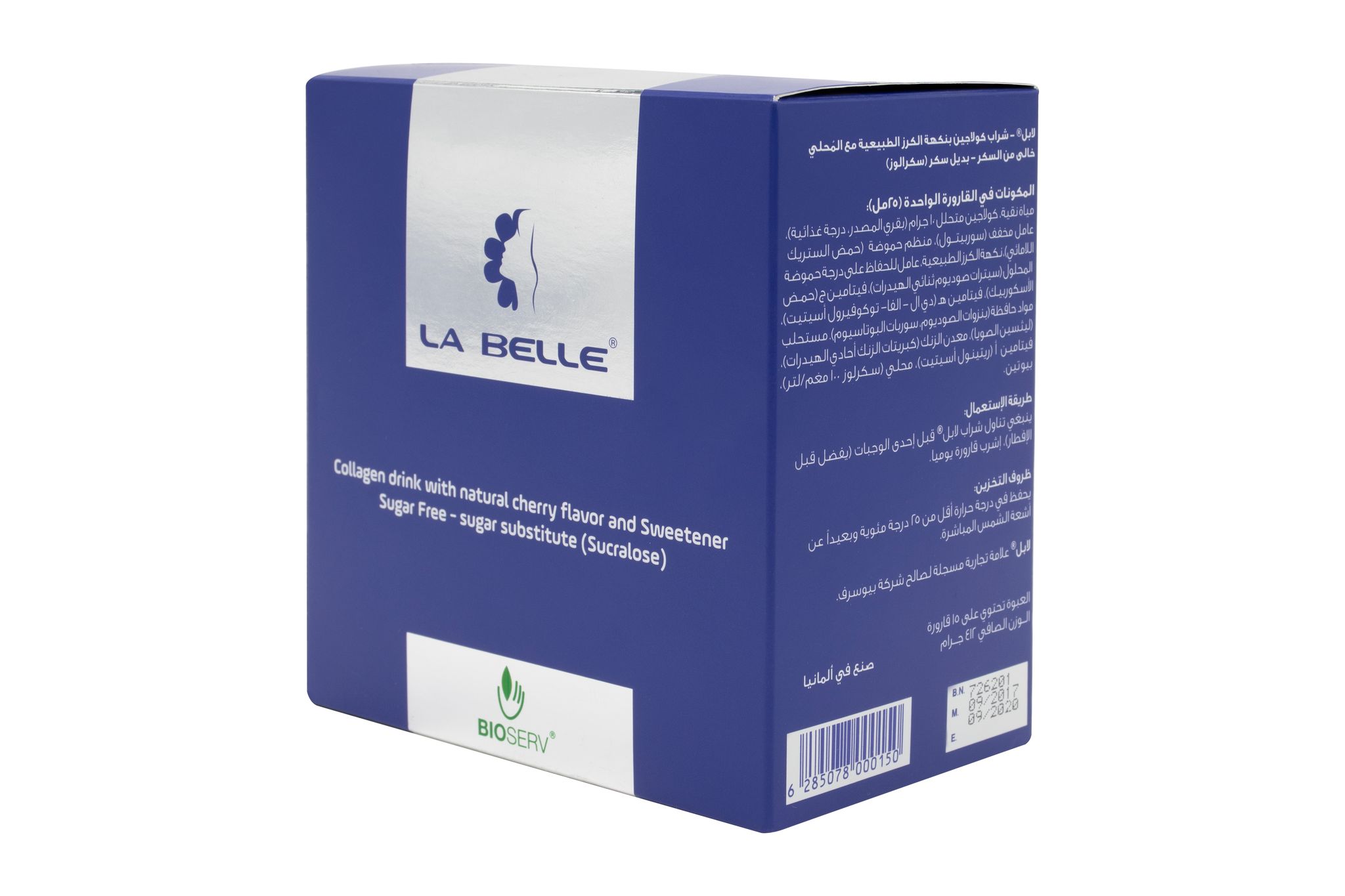 LA BELLE contains the following high-quality ingredients: VERISOL: Hydrolyzed collagen Type I contained in LA BELLE is sourced from HALAL bovine source. Each bottle contains 10 g hydrolyzed collagen Type I. Vitamin C: Essential for natural collagen formation and maintaining the collagen matrix. Biotin: Stimulate hair and nail growth. Vitamin A: Promotes a healthy skin. Vitamin E: Anti-oxidant, nourish the skin and hair cells. Zinc: Anti-oxidant, Promotes healthy hair, nails, and skin. Natural Cherry flavor.