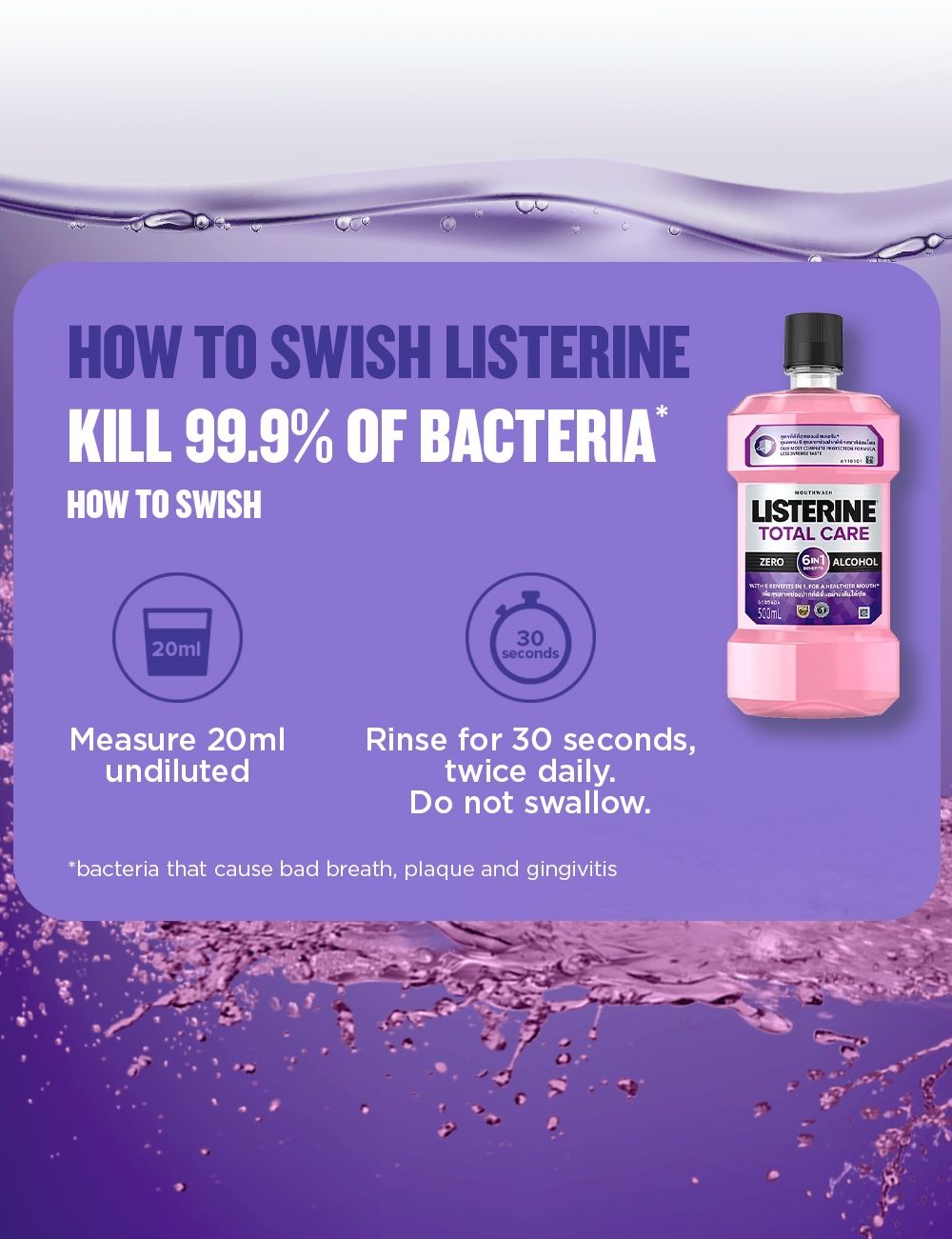 للشعور بالرضى في كل لحظة! إنّ ليسترين العناية الكاملة زيروغسول فم ذو مذاق قليل الحدة وهو خالٍ من الكحول. فهو يحمي الأسنان وهو متعدد الفوائد لصحة الفم والأسنان كاملةً. لأفضل النتائج، يُستخدم مرتين يوميًا.