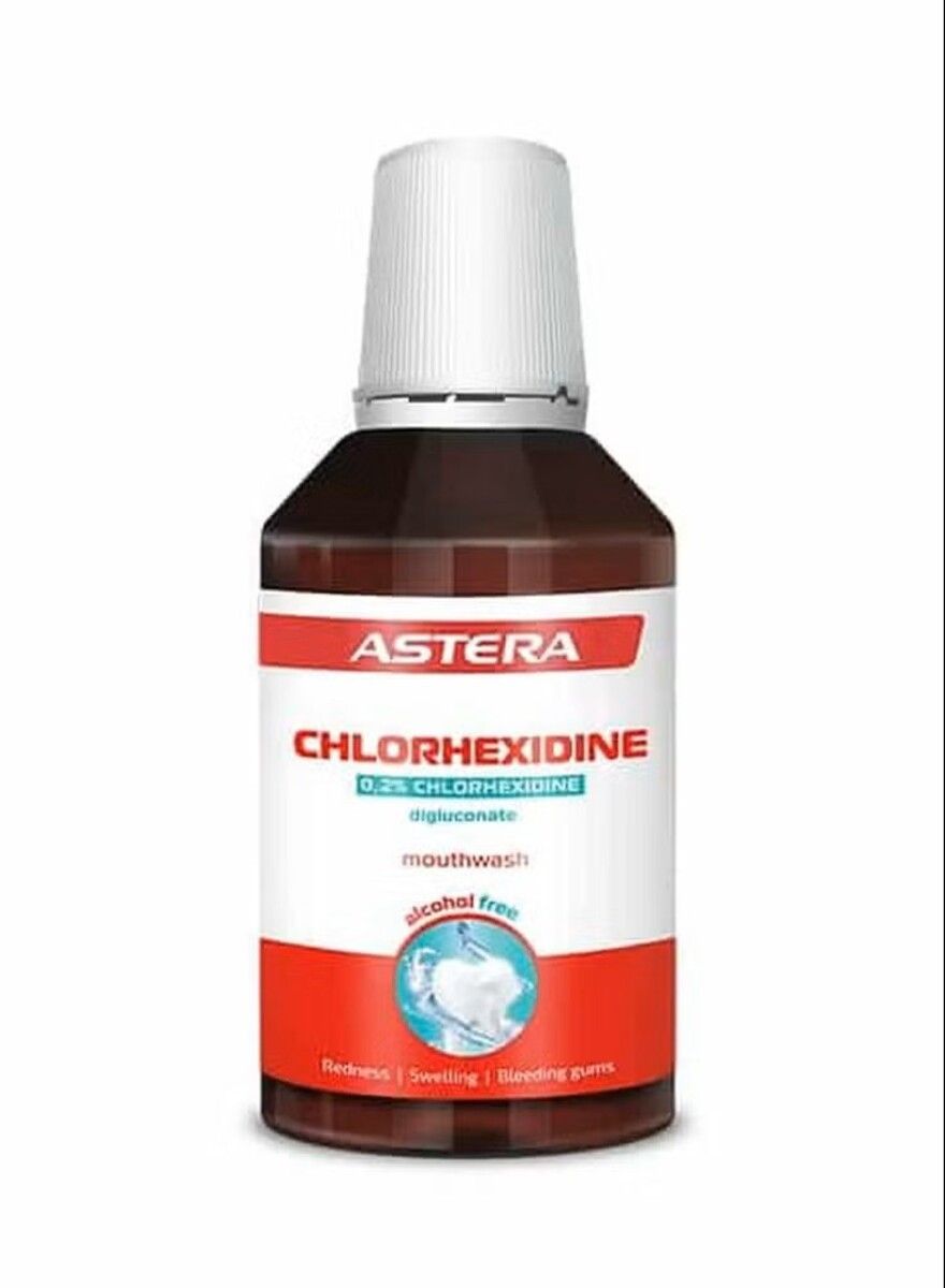 ENG: ASTERA CHLORHEXIDINE / 0,2% Chlorhexidine digluconate / • Helps to combat gum problems • Fights plaque • Help prevent bad breath Mouthwash specifically developed and intended for intensive care of inflamed gums, periodontitis, aphthae and other inflammatory processes in the oral cavity. Helps maintain the oral hygiene before and in the healing process after dental intervention. Contains chlorhexidine digluconate with antibacterial action. ACTION: • Refreshes the breath ACTIVE INGREDIENTS: 0,2% chlorhexidine digluconate. DIRECTIONS FOR USE AND WARNINGS: Rinse your mouth amply two times per day for a minute each, using 10ml of mouthwash. Brush your teeth with toothpaste and a toothbrush beforehand and rinse well with water. For adults 16 and over! Keep out of reach of children! Coloration of teeth is possible when using for a prolonged periods of time and will disappear after suspending use of the product. Warning: Do not swallow! Contains 0.2% Chlorhexidine Digluconate. Producer: Aroma AD, 12 Kiril Blagoev str., 1271 Sofia, Bulgaria