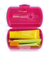 An exceptional, compact travel toothbrush, 10ml zesty fresh whitening toothpaste and two interdental brushes with a handy holder. The ultimate Curaprox oral health care. No compromise on style. No compromise on oral health. Your favourite Curaprox products in your suitcase, your hand luggage – or in your pocket. This vibrant, stylish travel kit measures just 9.5 cm x 6 cm. Contains: ● CS 5460 travel toothbrush: Relentless on plaque. Relentlessly gentle on your teeth and gums ● Curaprox Be you toothpaste Rising Star Grapefruit + Bergamot, 10ml: Protects and cares for teeth and gums. Gently and effectively whitens ● CPS prime interdental brushes, size 07-red & 09-yellow: Effective brushing in the spaces between your teeth