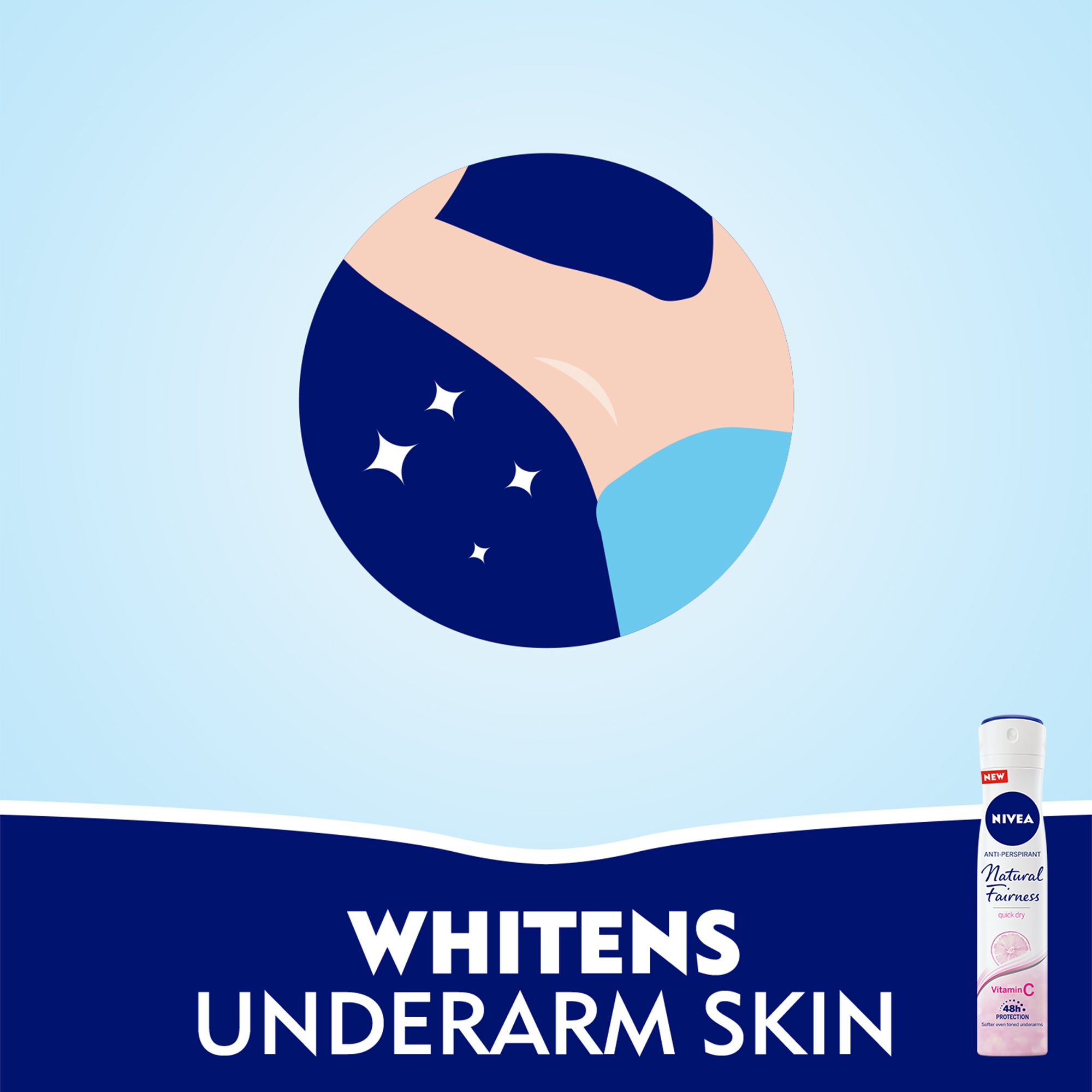 Nivea Deodorant Natural Fairness with Vitamin C and Licorice enhances skin's fairness in just 2 weeks all while soothing and protecting all day long. Enjoy visibly fairer underarms with a 3 in 1 formula that soothes, protects and enhances skin's fairness.