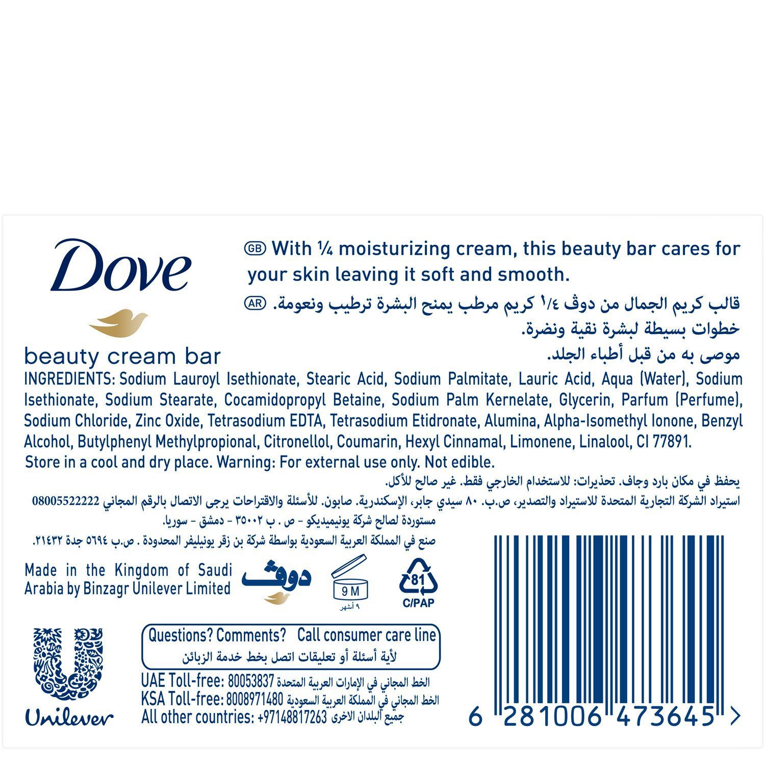 6466254f19c112a5b2f00bdbDove Beauty Bar Soap White 135https://www.kunooz.com/s/5e5b8eb5e1a30016118f588f/6469b4565b1489fe0b081fc1/32483.jpgProduct Description: Dove Beauty Bars are specially formulated to deliver skin natural nourishment, helping your skin to keep its natural moisture during cleansing. Dove Pink Beauty Bar contains our ultra-mild cleansers, which don’t strip skin of moisture like a regular soap bar can. It’s mild enough to be used on your face, body and hands – the perfect addition to your daily skin cleansing routine. Refreshing cucumber and green tea scent revitalises your senses ¼ moisturising cream and mild cleanser Leaves skin softer, smoother and more radiant Dove doesn’t dry skin like soap can Suitable for daily use on face, body and hands How to use: Store in a cool, dry place Caution & Warnings: Not Edible. For external use only32483