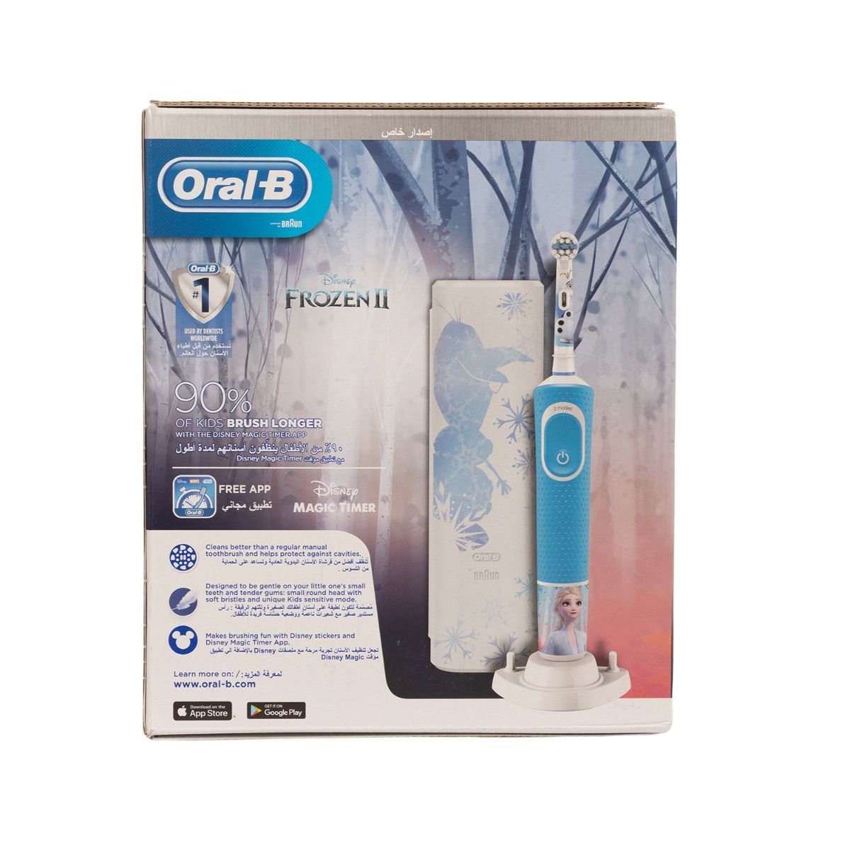 646624d118a2cf669dc89dc9Oral-B, Toothbrush, Electric, Frozen Edition, Travel Case, For Kids, From +3 Yearshttps://www.kunooz.com/s/5e5b8eb5e1a30016118f588f/6469b35f69eea61b089cf8c9/42727.jpgDescription It is important to Find a toothbrush that feels comfortable and works effectively for your teeth, especially if you want to maintain oral health and hygiene. Not only do toothbrushes brighten your teeth, but they also help prevent bacteria from causing inflammation of gums. Their uniquely designed features facilitate cleaning teeth, gums, and tongue. It has a special head shape that makes it simple to access confined spaces. Comes with a non-slip handle for better grip while brushing. Benefits It helps you to clean your teeth It helps you to maintain your teeth brightness. It helps you to get rid of bad mouth odor. How To Clean Your Teeth With Toothbrush & Toothpaste Choose the proper toothbrush (soft, medium, or hard) and the proper toothpaste based on your teeth and gum condition Comfortably hold the toothbrush. Wet the brush head and apply toothpaste. Start brushing the upper jaw. Take your time, moving the toothbrush in gentle, circular motions to remove plaque Move the brush from up to down the jaw. Brush the teeth from the outside and inside Do not forget to brush your tongue or use a tongue cleaner. Toothpaste is a necessary product that has to be used daily. Do not swallow toothpaste. Supervise children as necessary until capable of using them without supervision. Dentists recommend changing your toothbrush every 3 months. Storage Condition Store it in a cool, dry place away from direct sun exposure Keep out of sight and reach of children. Store away from excessive heat and direct sunlight. Advice To Maintain Teeth Health Brush your teeth every morning and evening Learn how to wash your teeth properly. Take your time, moving the toothbrush in gentle, circular motions to remove plaque Gently brush your tongue every time you brush your teeth; this will help you not only to remove bad mouth odor, but it can also help manage other oral health problems. Floss your teeth at least once a day. Flossing is as important as brushing. Minimize sugary foods and drinks in your diet. Avoid smoking as it may negatively influence your teeth health Over-consuming caffeine-containing beverages (like coffee, or tea) may lead to the development of yellowish color on your teeth. Mouthwashes play a crucial role in maintaining healthy teeth and gum, besides their role in amending bad mouth odor. See your dentist every 6 months for an oral examination and teeth cleaning.42727