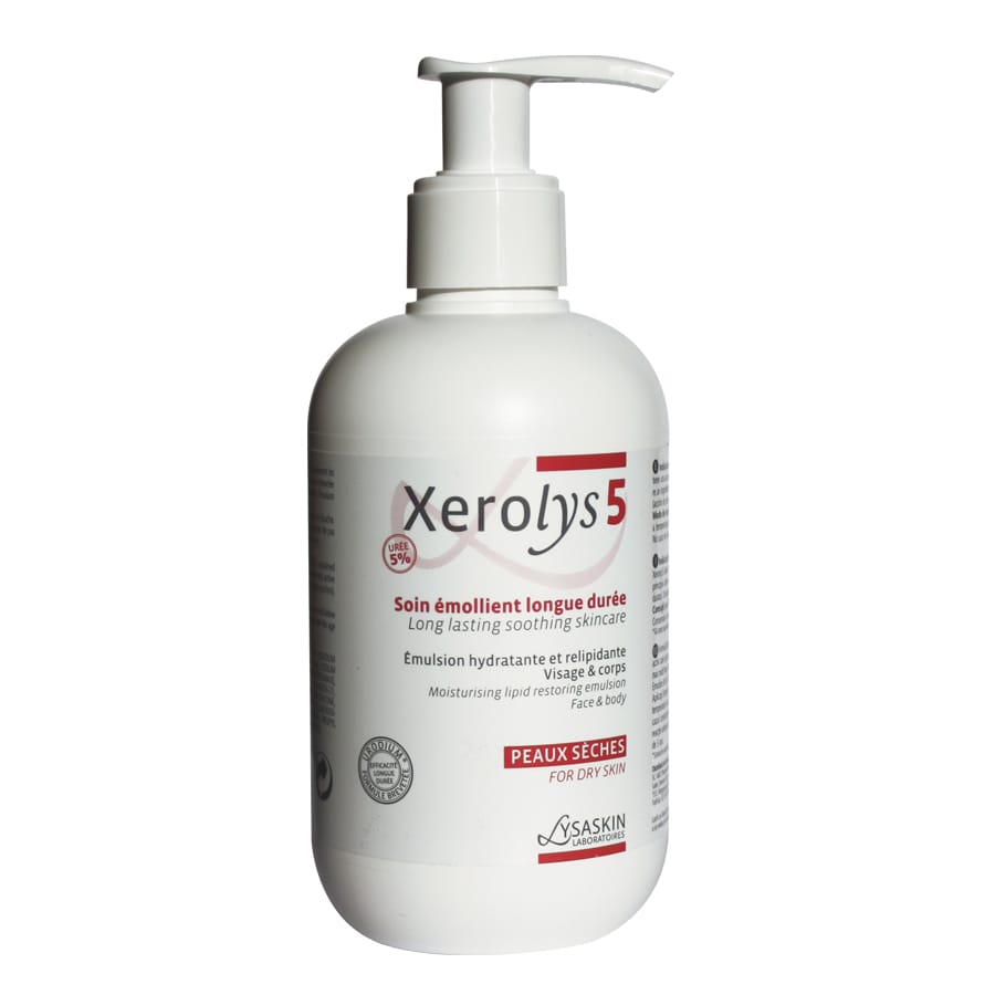 # Long lasting moisturizing , soothing and relpidifying skin care 1# indicated for Xerosis, Climatic Aggressions, Skin Aging, Puvatherapy, Moderate Pruritus (itching),…Long-lasting emollient care for Dry skin 2# Moisturizing and lipid-replenishing emulsion – Face and body. 3# XEROlys 5 durably moisturizes dry skin and immediately brings it comfort, suppleness and soothing.